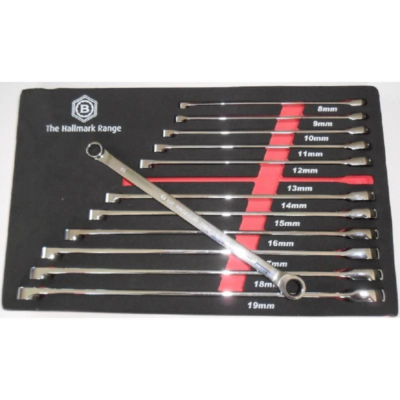 - Extra Long Flat Ring Spanners, each with a standard 12 point Ring End and a 72 tooth Ratcheting Ring End.